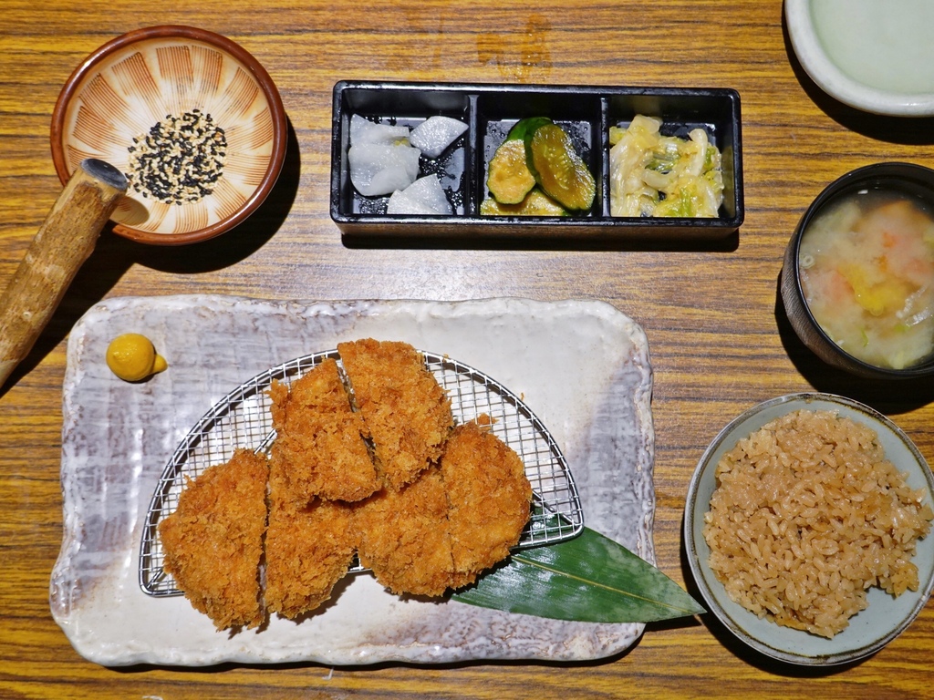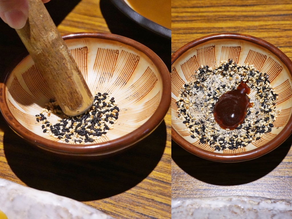 若點選單純的炸物定食,就會附上一小缽的芝麻可以自行研磨,我個人喜歡保留些許芝麻顆粒,吃起來較有口感。