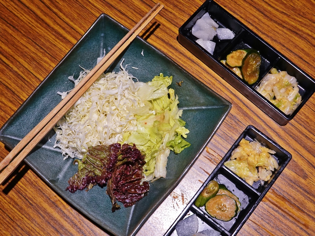 每人會附上一碟小菜(不能續加),分別是黃金泡菜、柚子蘿蔔和醬漬小黃瓜,可依喜好搭配肉類食用。