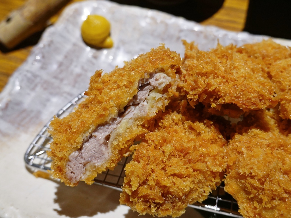 「赤神日式豬排」採用較粗的麵包粉與玉米油,經油炸後酥脆且無不適油耗味,無論單吃或是沾芝麻豬排醬都很美味。