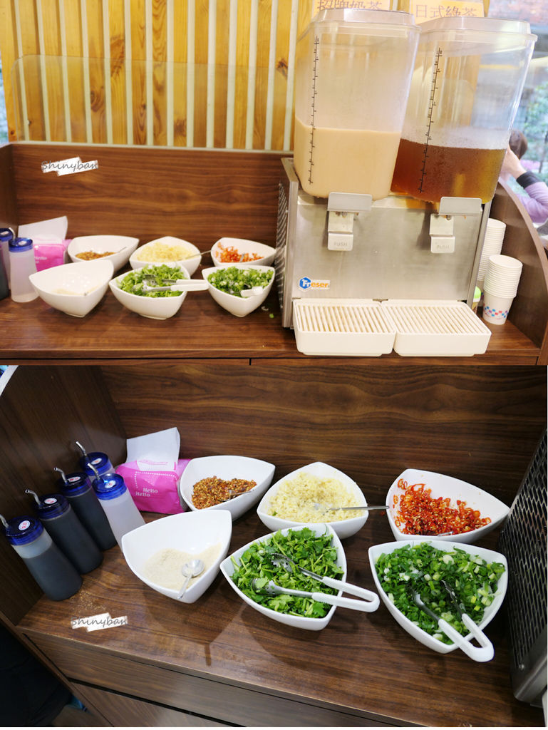 店內有醬料及飲料的自助吧,日式綠茶是無糖的,招牌奶茶喝起來不會太甜,奶香味又夠,比起許多早餐店都要來的好喝許多!
