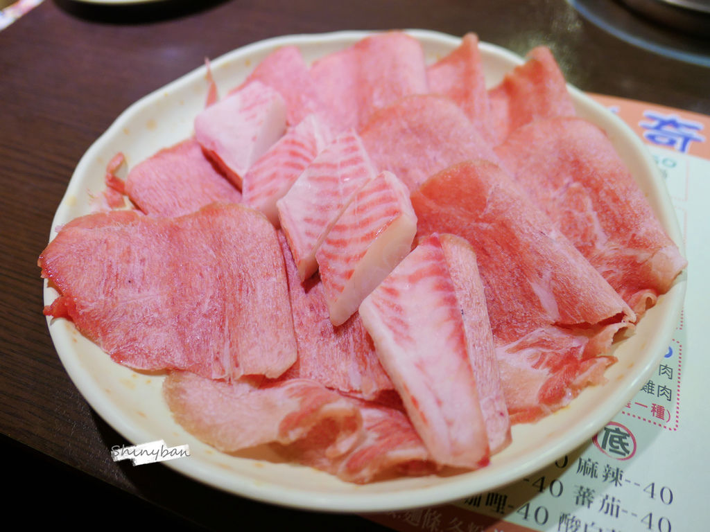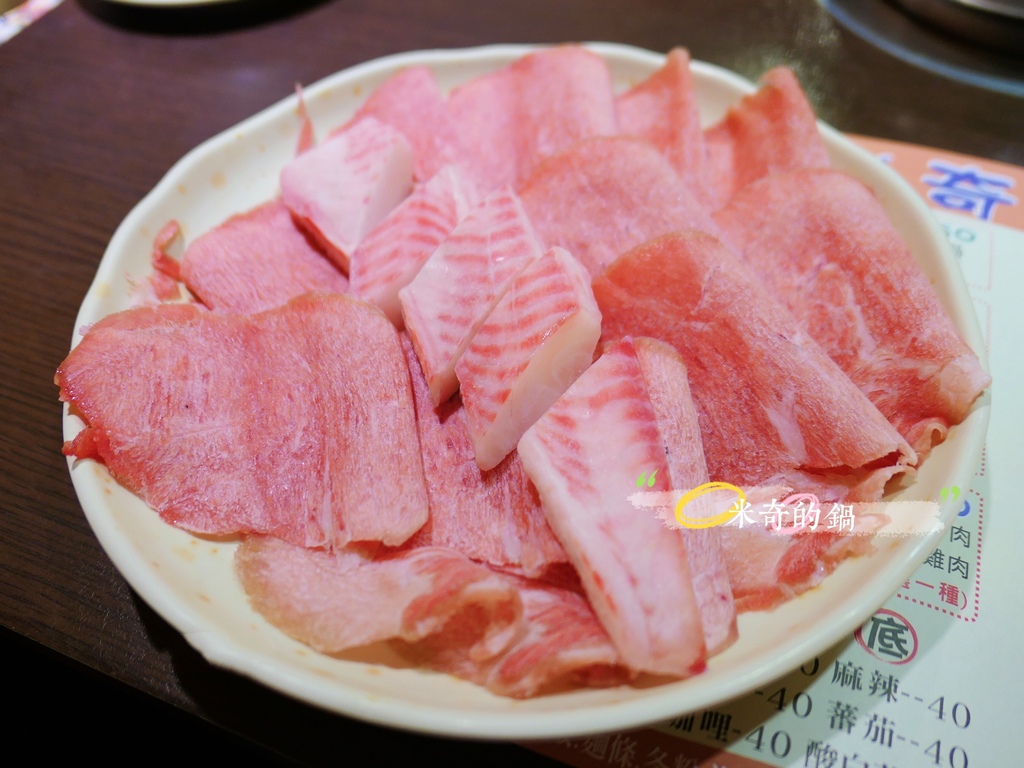 雖然是小海陸鍋,但是豬肉片跟鯛魚的分量仍然非常驚人,豬肉的油花不多,吃起來比較柴一些,但由於片的滿薄,不至於到難以下嚥;鯛魚片的厚度最厚大概有1.5cm,吃起來非常滿足。