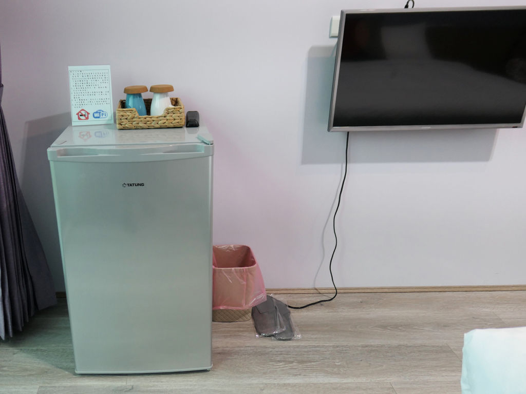 床的前方是電視,旁邊是小冰箱,冰箱上有一些沖泡的飲品,一旁有老闆的小叮嚀,花個30秒就可以看完。