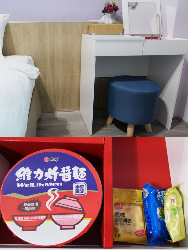在床旁有一個帶鏡化妝桌,桌子裡有附一碗泡麵跟一些餅乾,如果晚上肚子餓,懶得開車到玉里市區買東西吃,靠這些小東西也能稍微解解饞。