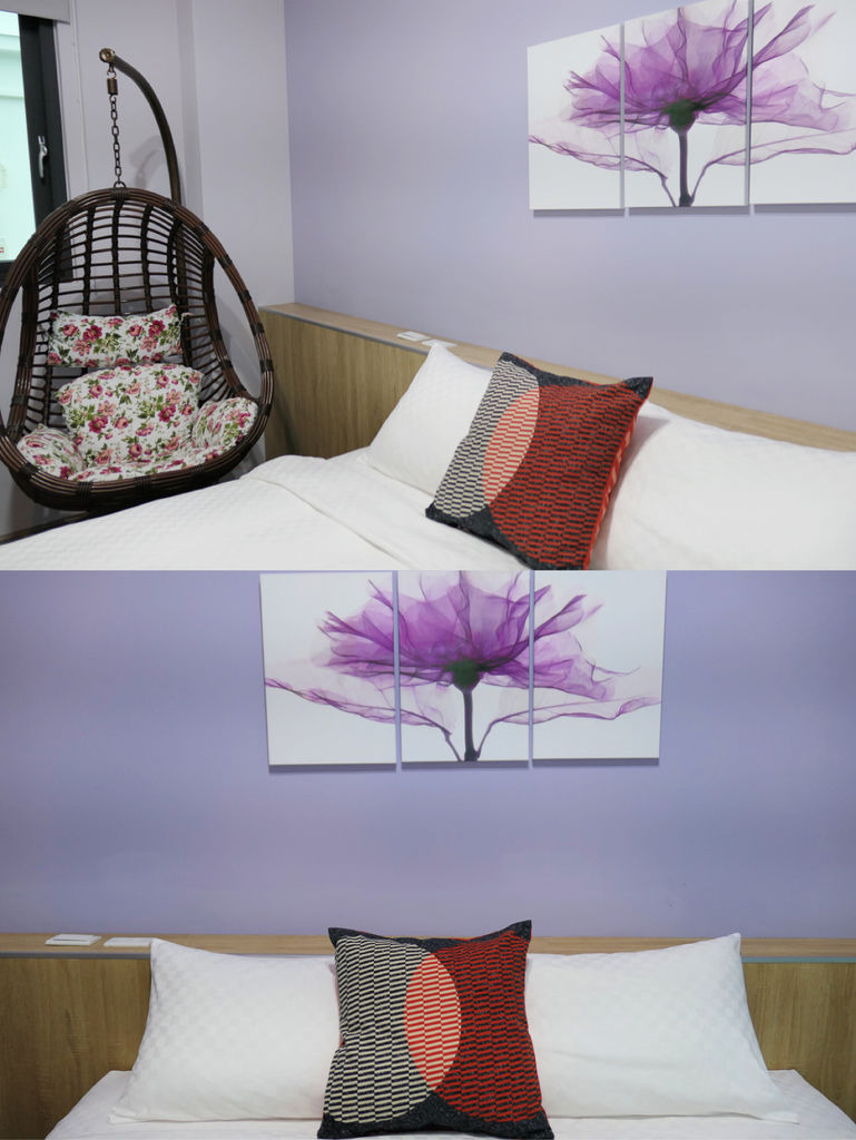 房內的布置簡單又溫馨,有種回到自己家的感覺,床頭淡紫色的油漆增添了一絲優雅的氣息,卻不會過於夢幻。