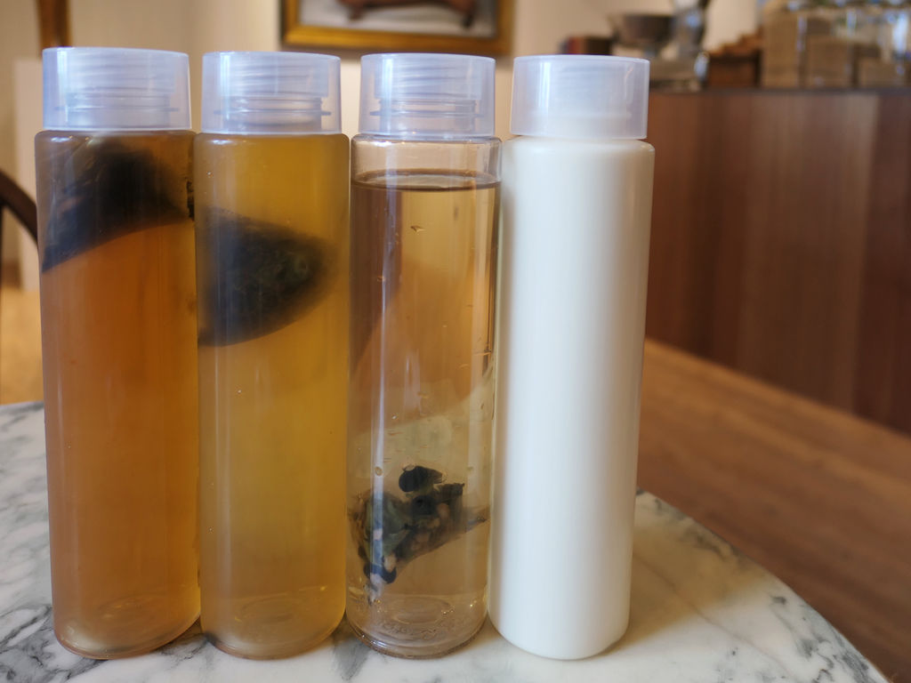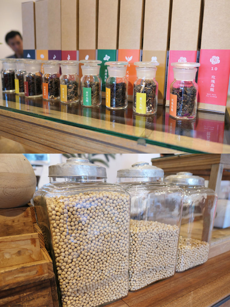 吧檯上有展示豆乳的原料黃豆以及冷泡茶的茶葉,喜歡台灣自然栽培茶的客人也可以直接購買。