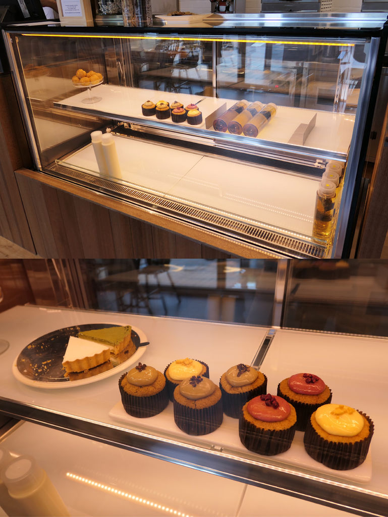 室內空間其實不大,切分為用餐區、甜點展示櫃以及吧檯。