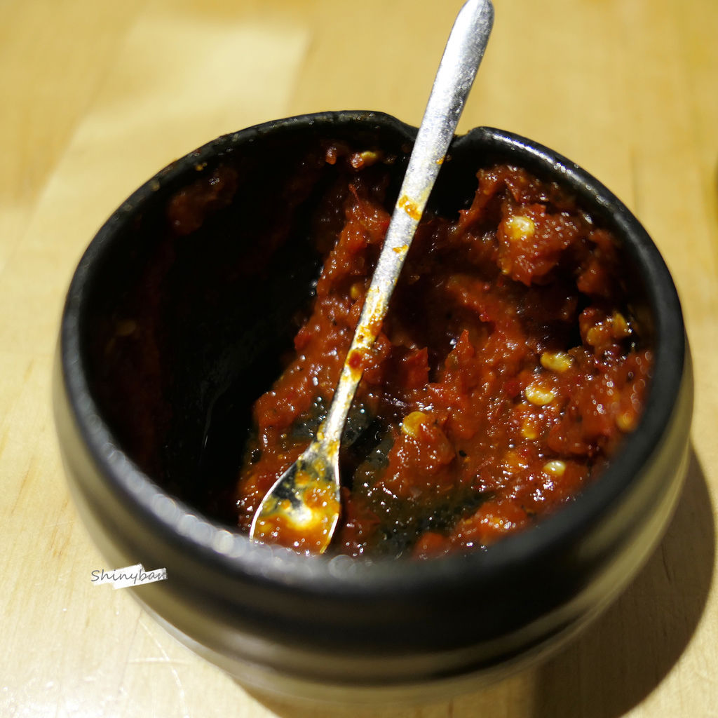 桌上擺放著一小盅辣椒醬,但可惜的是當天忘記添加。