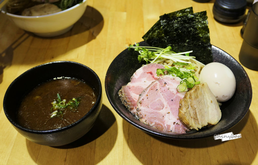 沾麵的湯頭才上桌就浮上一層油脂薄膜,可見這湯頭真的是濃厚得驚人!配上帶有嚼勁的粗麵,整個依附上湯汁,香濃夠味!但由於鹹度較高,建議不要在湯汁裡泡上太久。