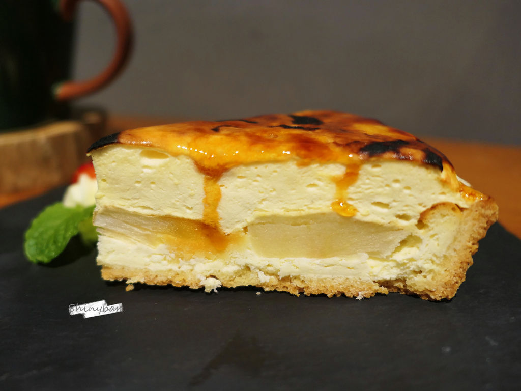 蘋果乳酪塔由上至下分別是焦糖、幕斯、蘋果、乳酪、派皮,吃起來層次非常豐富,酸、甜、鹹、滑順、柔軟、酥脆,一口咬下能夠同時感受。