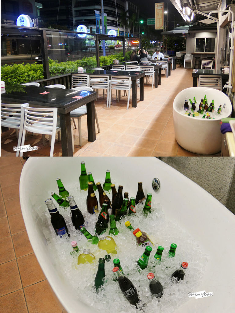 室外的用餐區非常開放,可以跟路人相互對視。飲品不是放在冰箱內,而是放在一個盛滿冰塊的浴缸裡,視覺看起來非常沁涼。