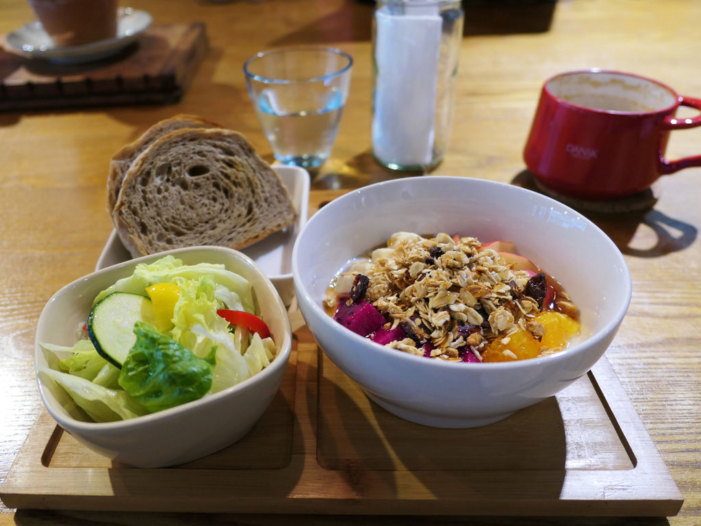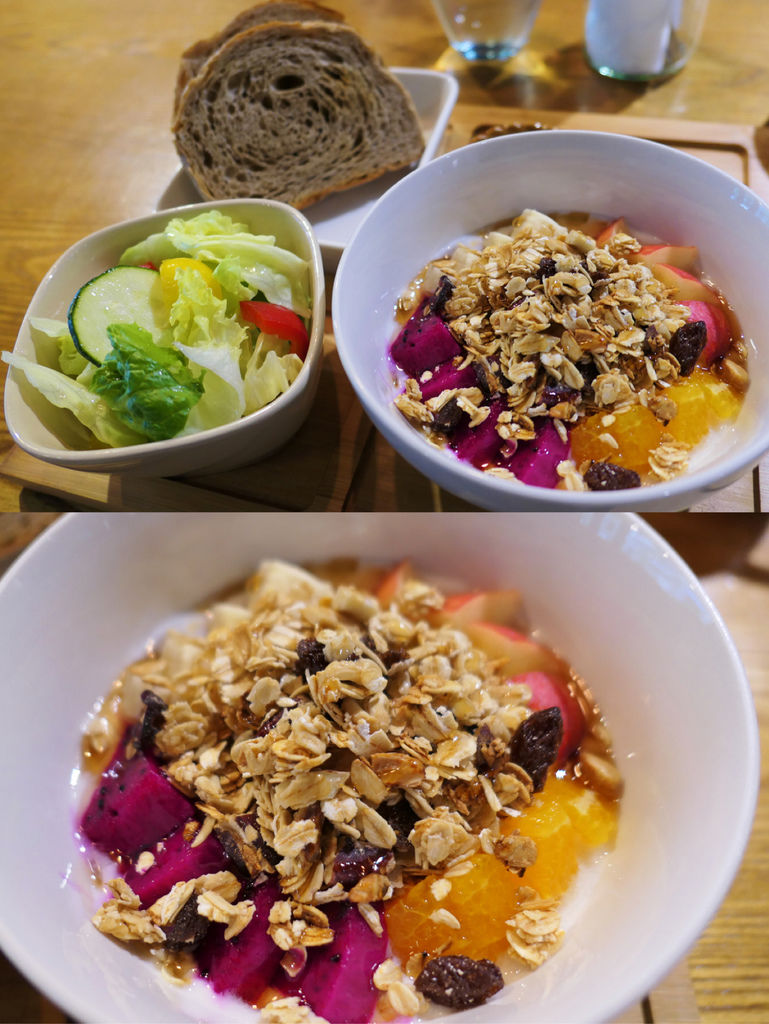 而重頭戲的水果穀麥優格,基底是無糖的優格,配上蘋果、橘瓣、香蕉、火龍果四種水果,上頭撒上穀麥及淋上些許蜂蜜而成,甜味很低,主要是來自於水果以及蜂蜜,健康又零負擔的一道餐點,非常對我的胃口!吃下來整個非常滿足又很飽。