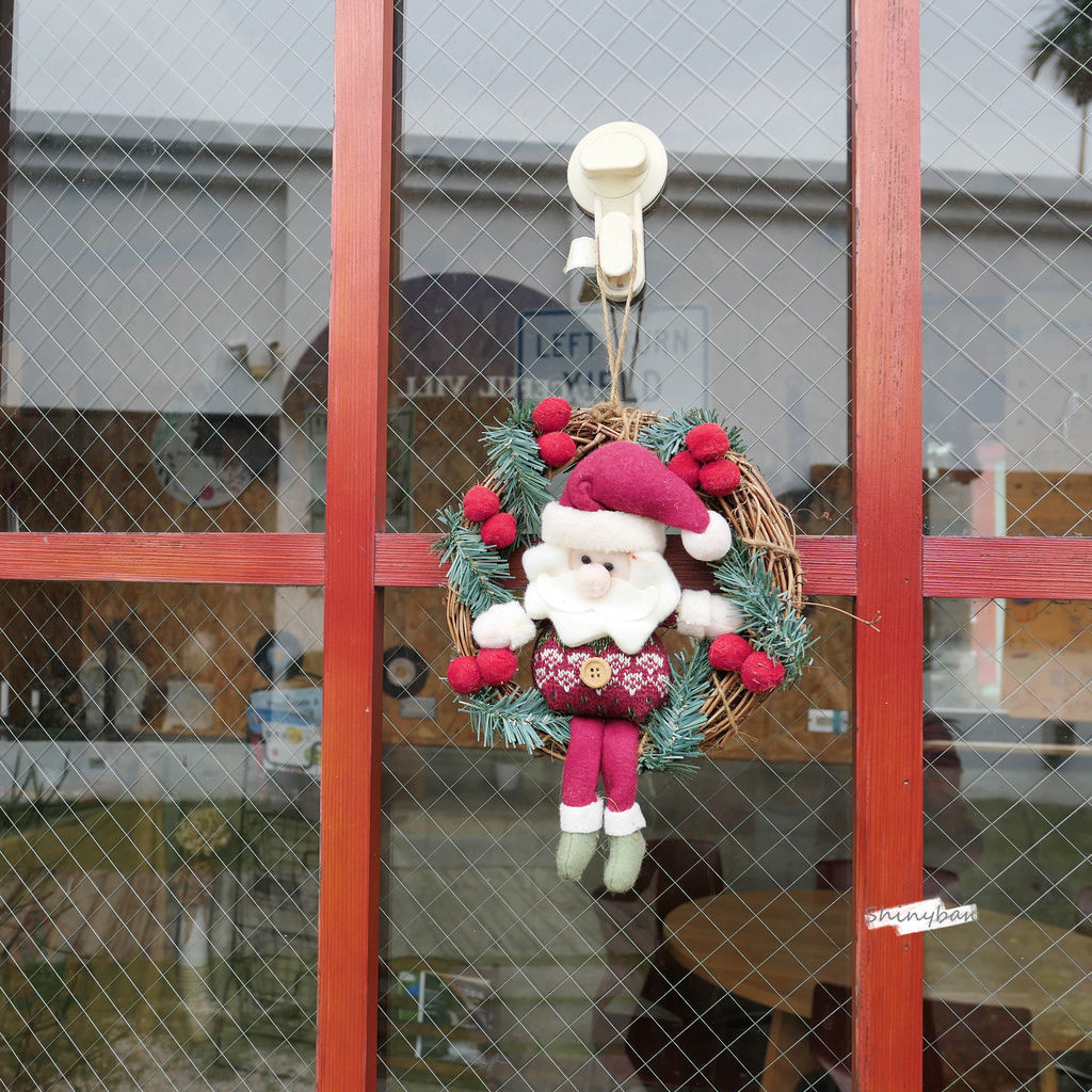由於正值聖誕節期間,所以紅通通的木門上,躺了一隻可愛的聖誕老公公。