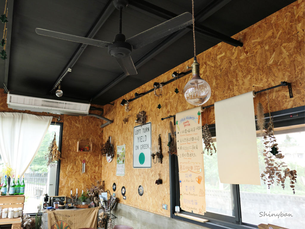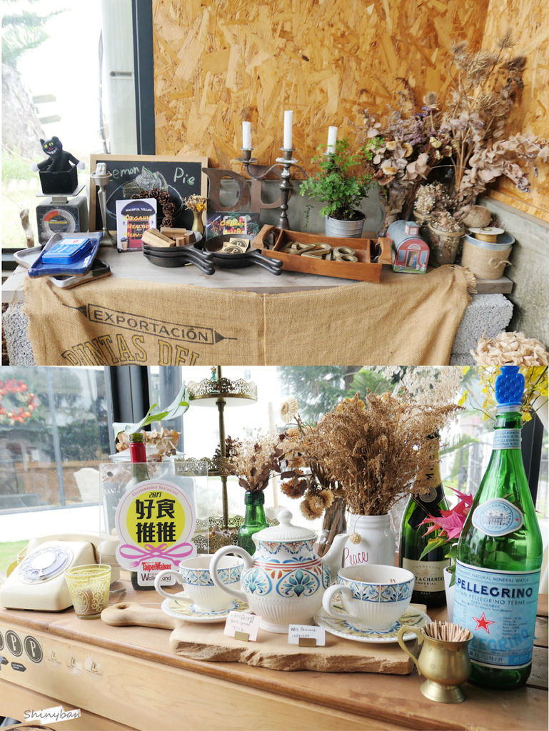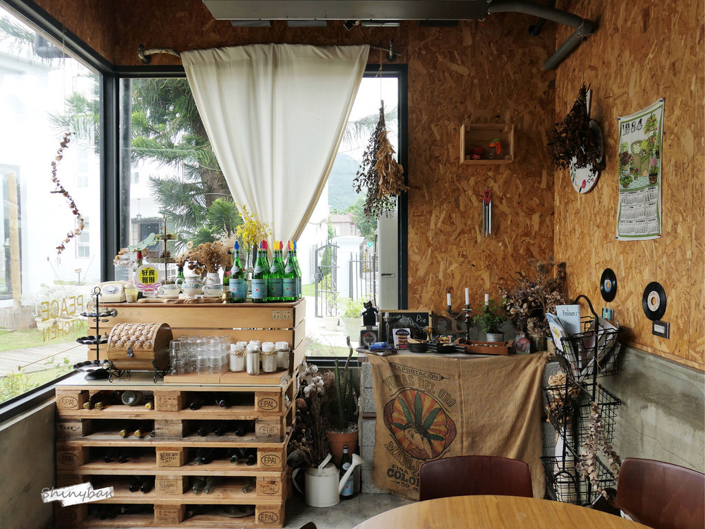 室內是使用很特別的軟木塞牆,配上木製桌椅,隨意搭上一些乾燥花以及老件。整體是沉穩的氣質,透過落地窗灑落的陽光,真的讓人感到好溫暖,內心得到的滿足,真的很難用文字完全表達。