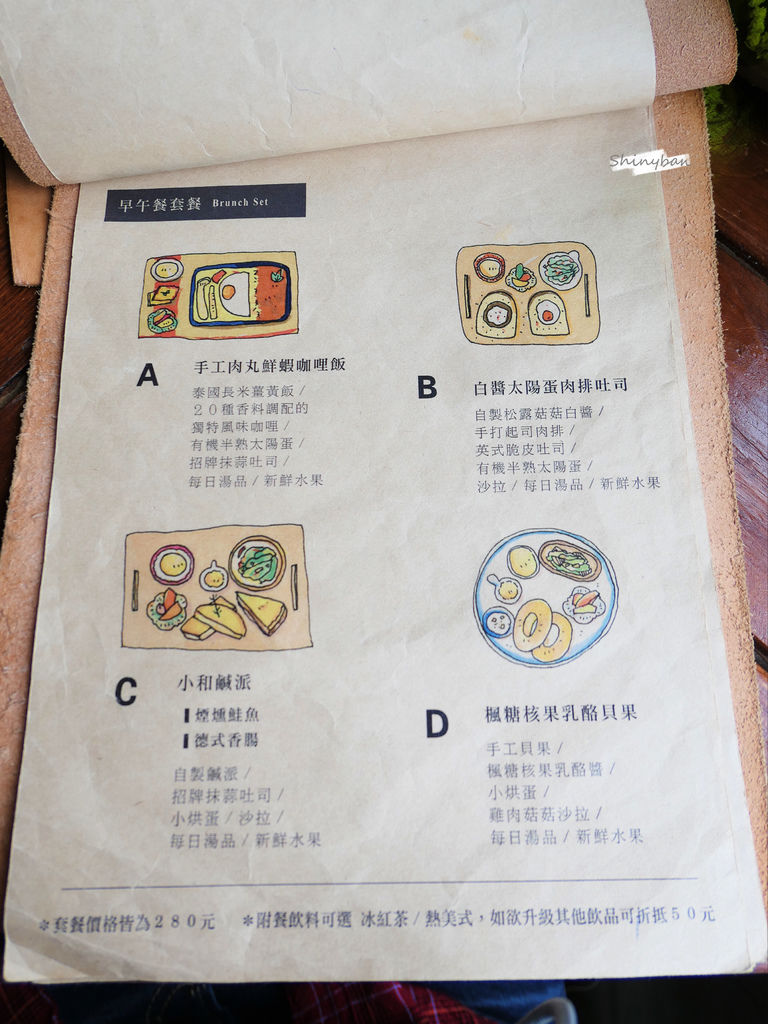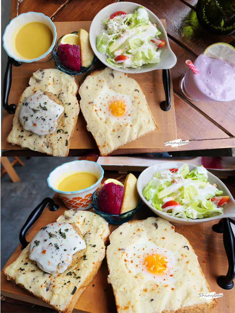 這原本是我最期待的一道餐點,但卻是讓我感到有點失望的,失望的不是口味,而是吐司有點難切,切到吐司邊時會碎屑掉滿整桌,整個桌子也會喀吱作響。另外切到太陽蛋時,整個吐司會變的過軟,蛋汁會溢到整個餐板上,不太方便食用。