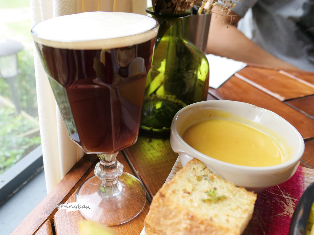 而套餐搭配的湯品及抹蒜吐司,絲毫不比主餐遜色。湯品今天是南瓜湯,喝起來香甜濃郁,說是南瓜泥也不為過。而店家招牌的吐司烤的香酥,蒜味抹醬鹹香鹹香,不知不覺中就吃完了。