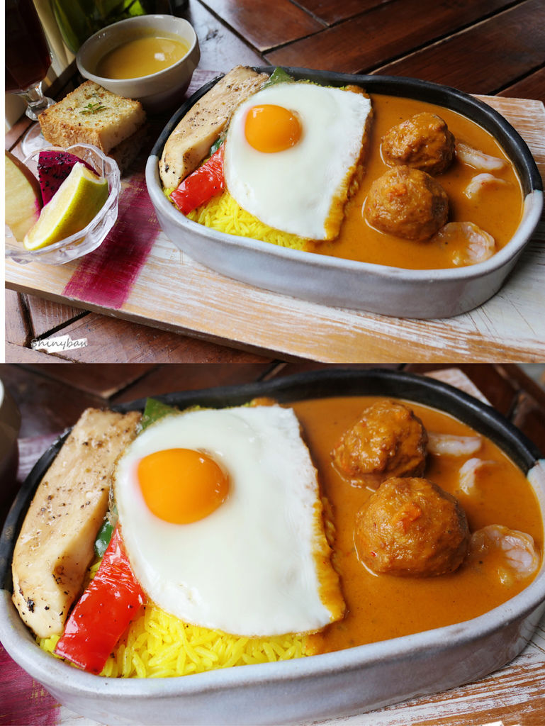 米飯部份是有口感的長米,薑黃飯與濃厚的南洋風味咖哩十分合拍,再將半熟蛋劃開後,口味又更加濃郁。肉丸部份超級紮實,依稀吃的到一些香料味,整體是很有飽足感的一道餐點。