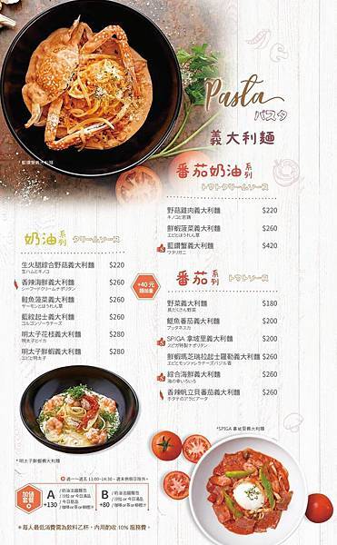 「SPIGA PASTA」位於南京復興站約五分鐘腳程,旁邊就是華航大樓,店家生意非常好,但沒有提供訂位服務,當天是打電話詢問店員人潮較少的時段用餐,才沒有排隊等候。