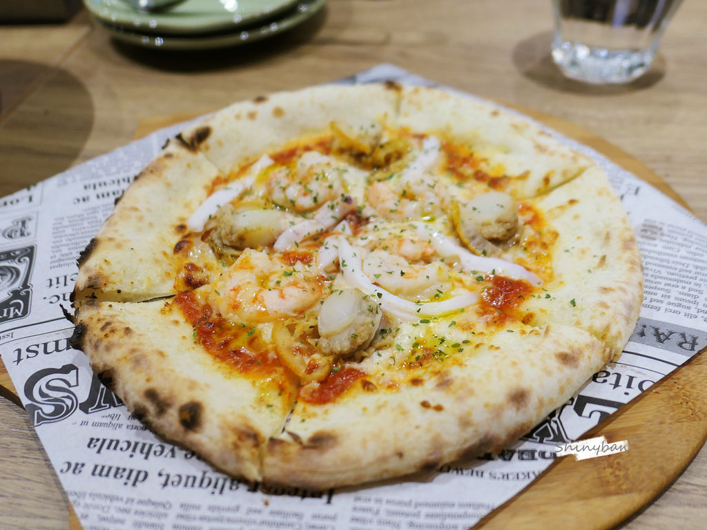 這裡的Pizza是六吋,不管是一個人吃或是兩人分食都是很OK,上頭的海鮮有花枝、蝦仁、花枝,吃起來都很新鮮。