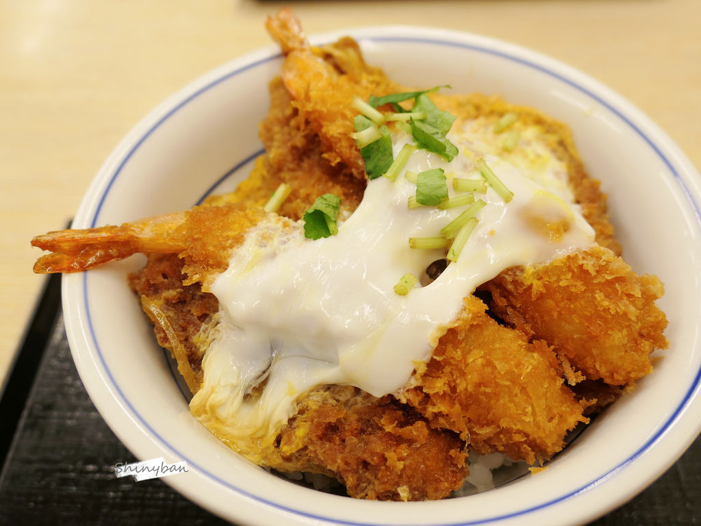 ▲炸蝦.腰內豬排.黃金漢堡排丼 745円(含稅)