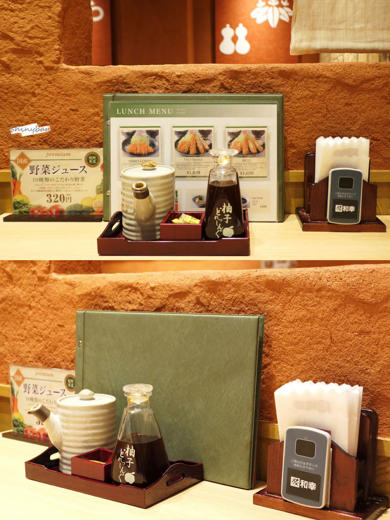 店員安排入座後,就會送上一杯熱茶,選好餐點就可以安下桌旁的呼叫鈴,店員就會來幫你點餐。桌上則是備有豬排醬及柚子醬可以做取用。