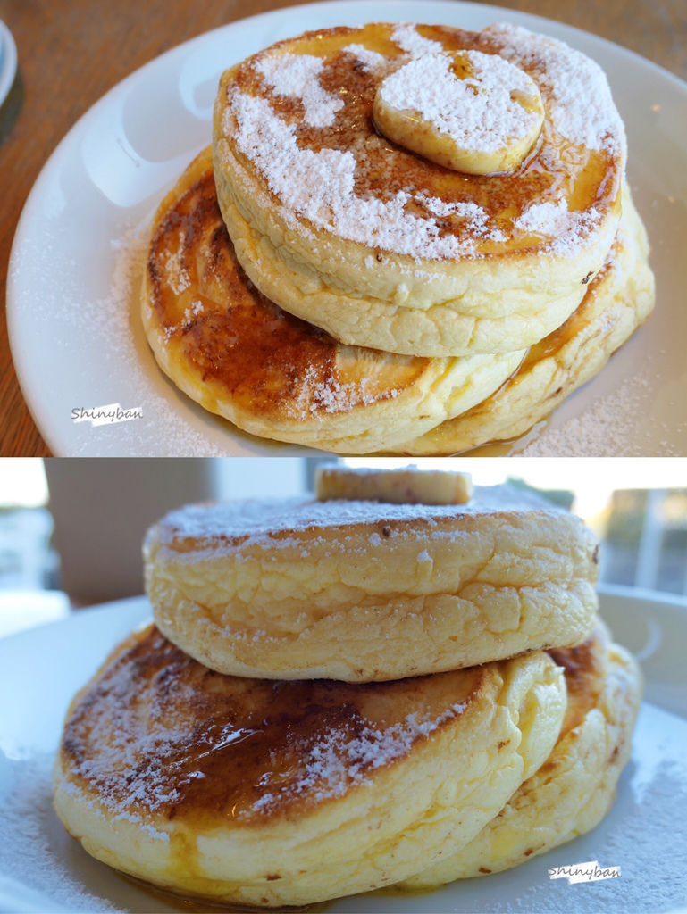 上方有撒上少許的糖粉,中間還藏有切片的奶油,會隨著鬆餅的熱度而融化,底下的香蕉可以配著鬆餅吃,楓糖漿是分開淋上,可以隨自己喜好的甜度做添加。