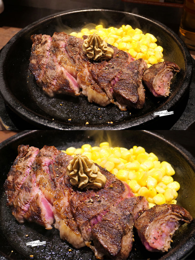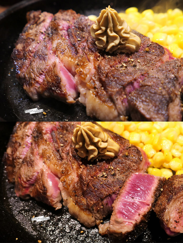 外脊牛排由於脂肪含量高,吃起來比豪爽大牛排軟嫩許多,雖然仍然帶點油筋口感,但咀嚼幾下就能入喉。