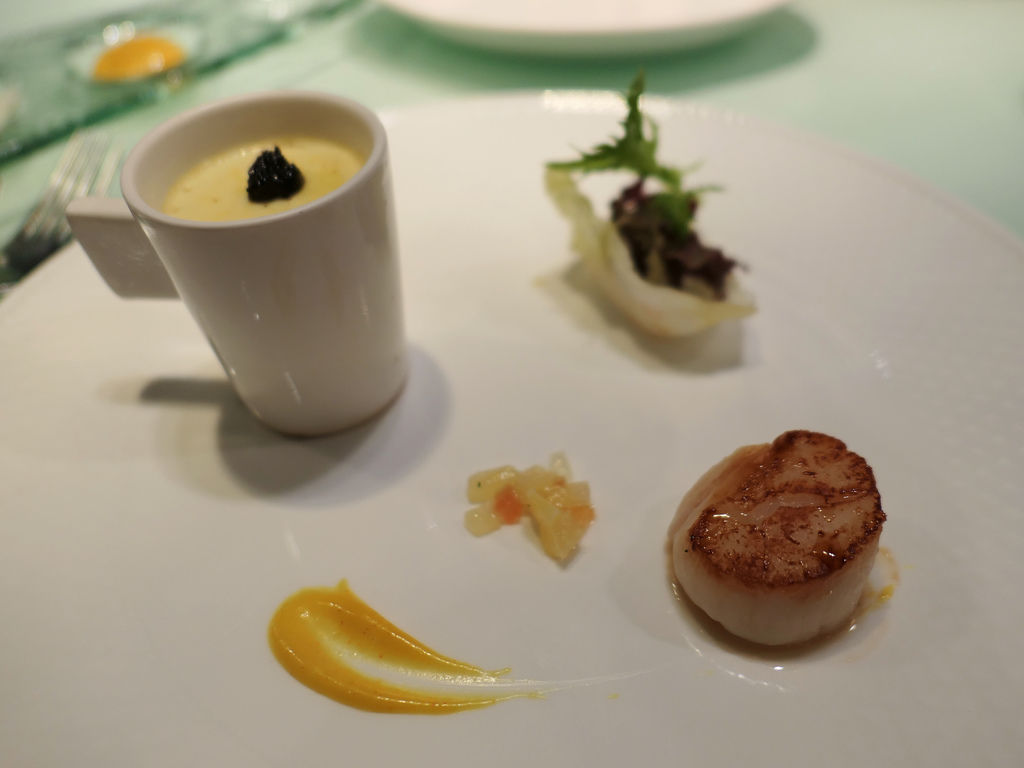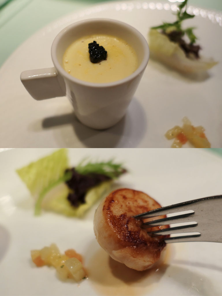 干貝是可以生食的等級,廚師會在面前的鐵板上現煎,吃起來保有軟嫩多汁的口感,非常好吃!