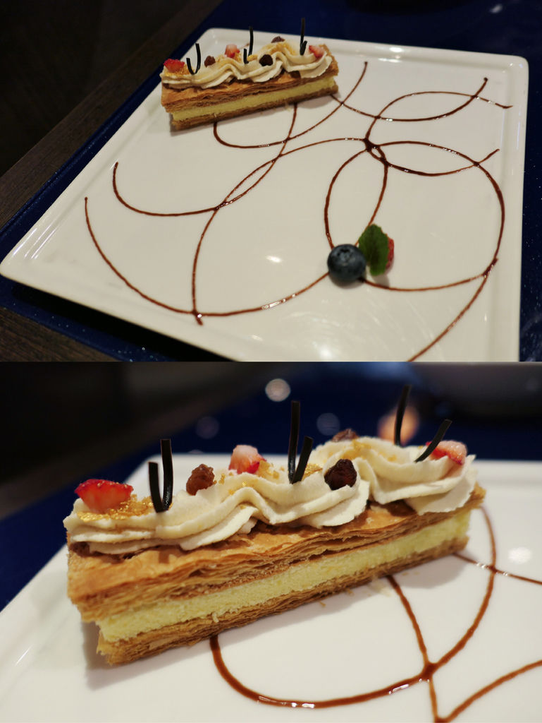 這道焦糖拿破崙派的擺盤真的很囂張,本體大概只佔了盤子的十分之一。但吃起來真的沒有看起來那麼美好…派皮整個軟趴趴的,整體口感吃起來偏乾。不得不說,甜點跟飲品真的算是夏慕尼的弱項。