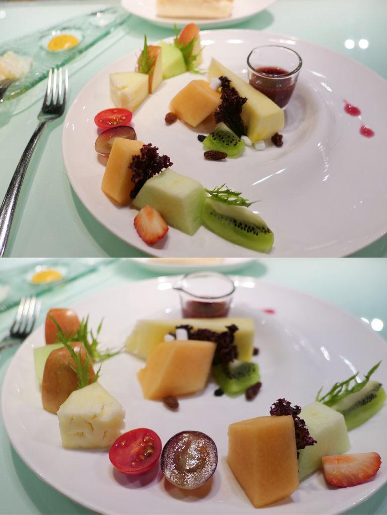 鮮果沙拉約有八種水果,中間有莓果醬可以淋上,很健康的一道沙拉。