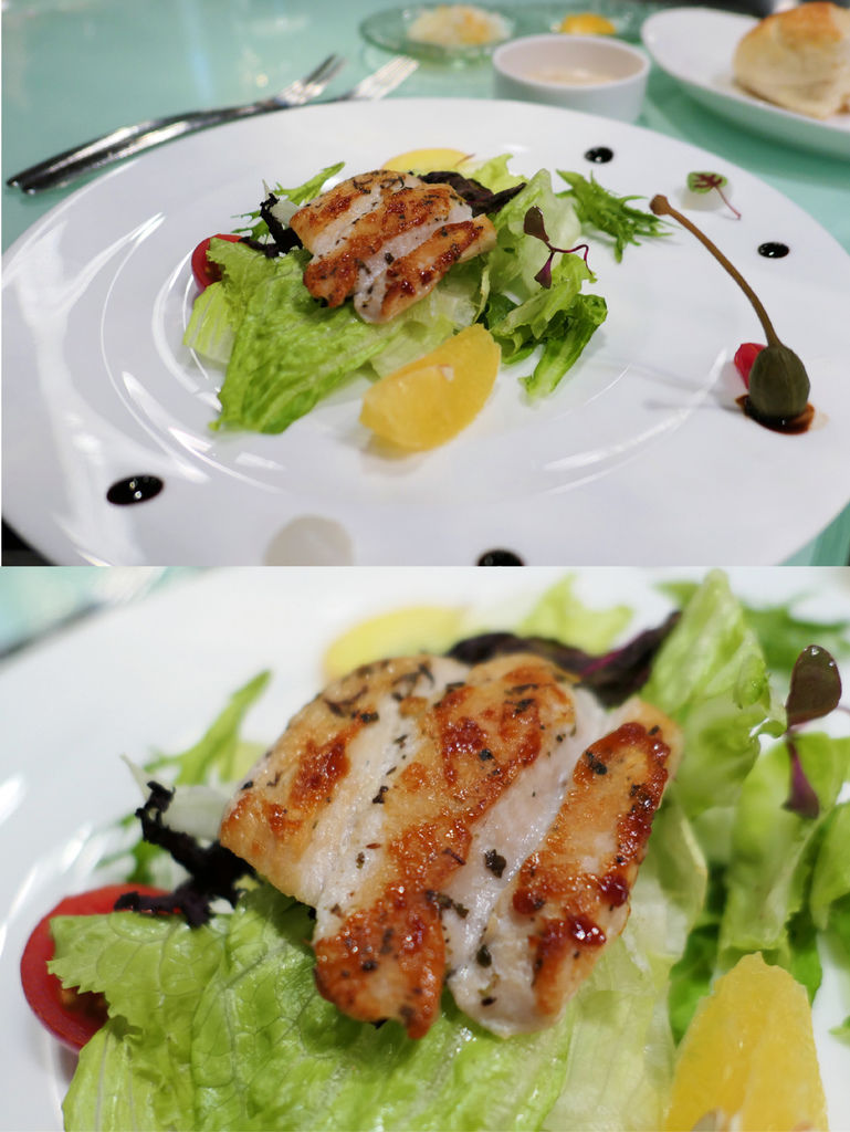 我是一個很愛吃沙拉的人,蔬菜很新鮮,雞胸香料味很重,但煎的有點過熟,所以吃起來有點乾硬。