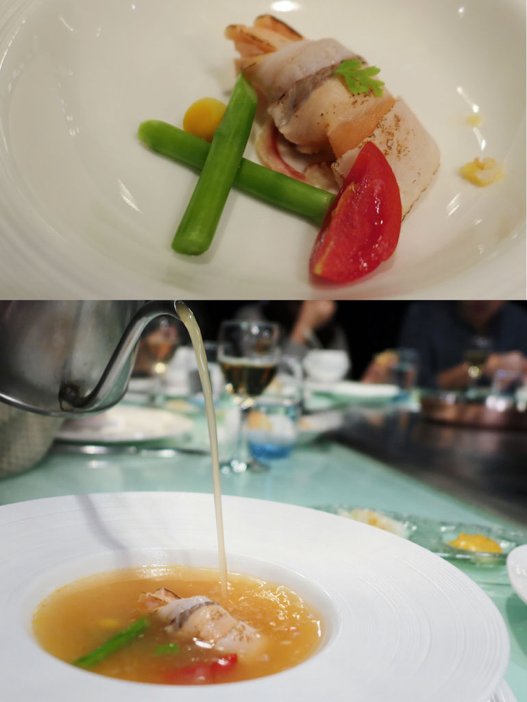 海鮮清湯內容物有鮭魚、鯛魚、花枝、番茄及蘆筍,上桌後服務生會直接倒上清湯,味道喝起來是清淡且清爽的,更能突顯食材的新鮮度。