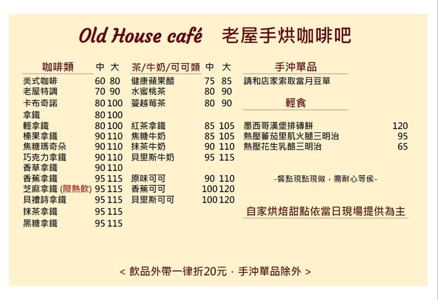 ※備註:免收服務費 / 提供wifi / 部分座位有插座 / 飲品外帶折$20(手沖咖啡除外) / 假日用餐限時兩小時