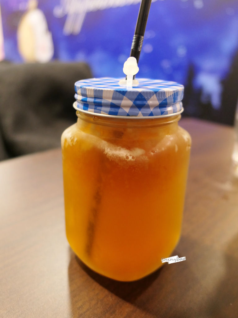 由於避免貓咪跳上桌把飲料打翻,店家很貼心的準備封口的玻璃罐呈裝,喝起來就是有蜜桃跟柚子香氣的茶,表現一般。