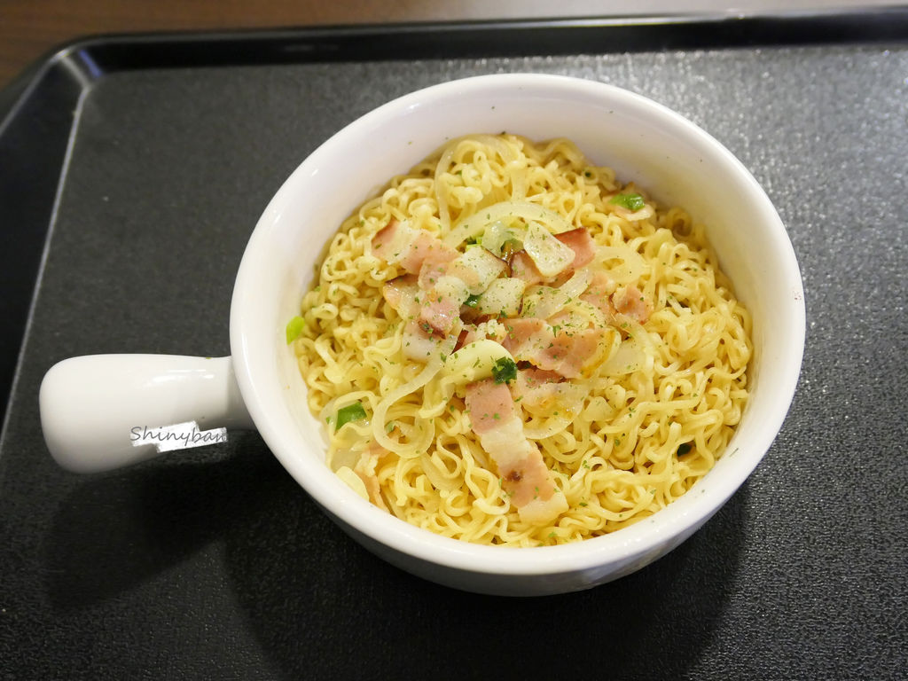 白話來說,就是乾的泡麵加上培根跟洋蔥,還有一些香料,吃起來有點乾。
