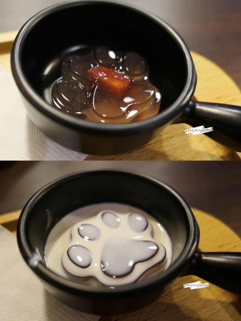 附贈的甜點是貓爪造型的茶凍,淋上奶精之後造型更明顯了,是不是超可愛!