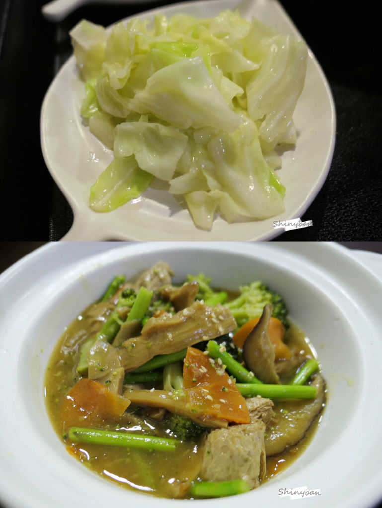 當天的時蔬是高麗菜,炒得很爽脆,而主餐裡的材料有:蘆筍、筍、腐皮、香菇、杏鮑菇、紅蘿蔔等。