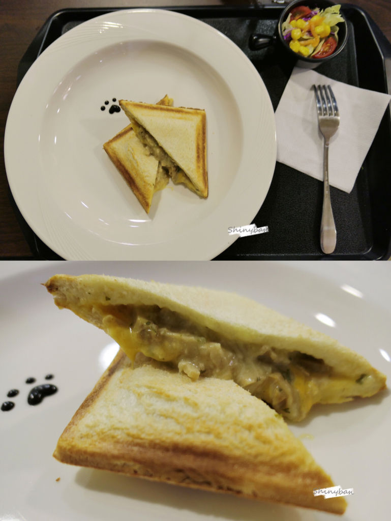 這道餐點的盤子超大,三明治主體大概只佔了1/3,一旁有附上沙拉,新鮮度一般。
