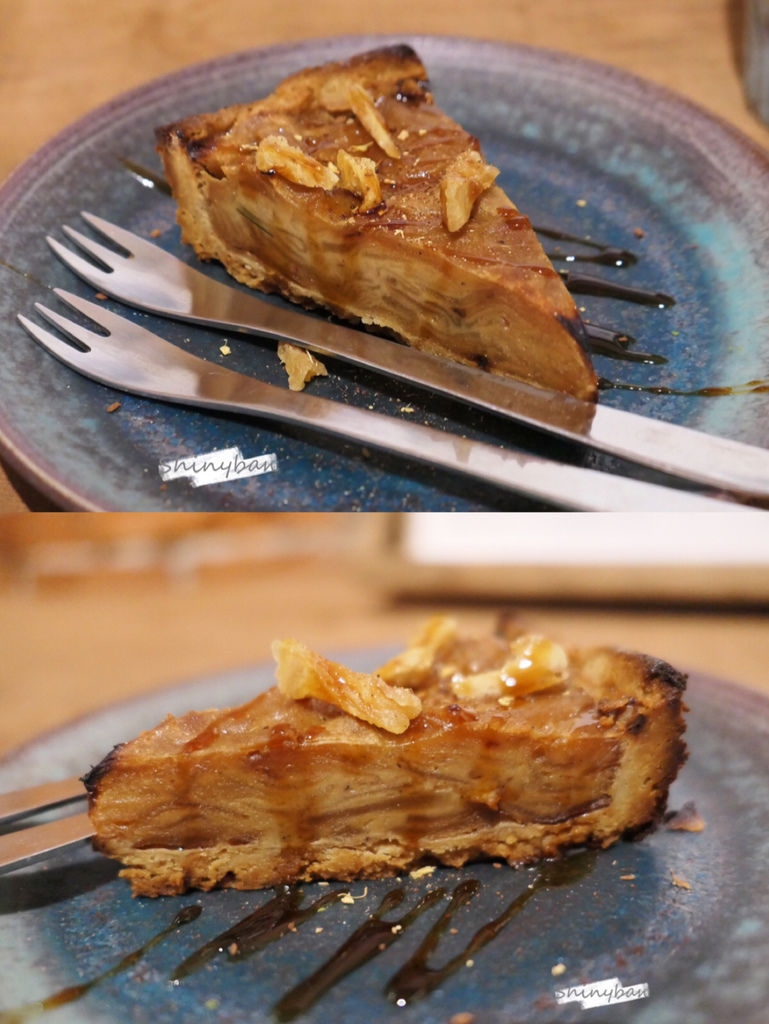 蘋果片的很薄,但仍能吃到吃到脆脆的口感,底下則是偏硬的派皮,邊緣烤得有點焦香,上頭淋上焦糖醬,搭配肉桂香氣及蘋果微微的酸甜,整體口感跟味道都很融洽。只是份量有點少,真是讓人意猶未盡。