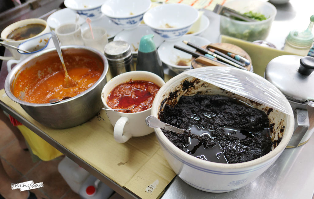 在店家門口有擺放三大盆的醬料,由左至右看起來應該是香辣醬、辣醬以及炸醬。