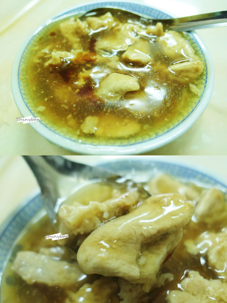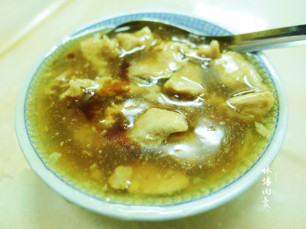 「林場肉焿」的勾芡較濃,比一般的羹湯更為有存在感,除了肉焿外沒有其餘的配料,所以完完全全的成為了唯一的主角。肉焿沒有使用漿汁包裹,是很完整的肉塊,吃起來紮實卻不乾柴,調味中規中矩,鹹度適中,微微帶點蒜香及甜味。