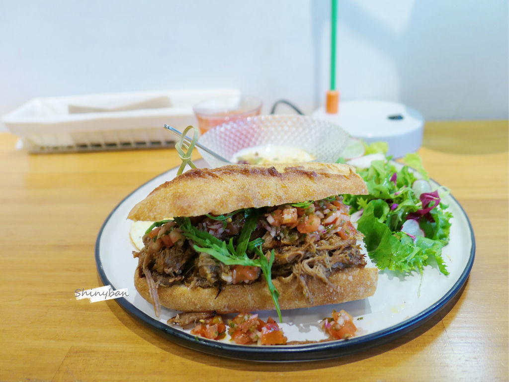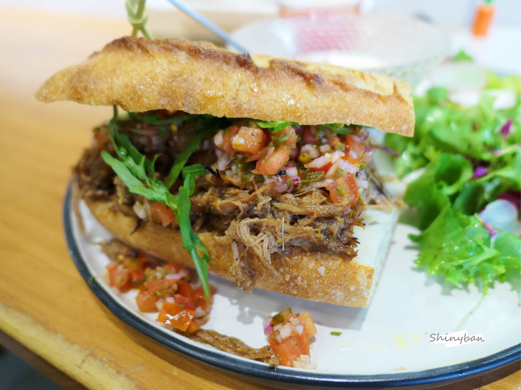 麵包偏乾硬,所以很不好食用,夾餡的手撕豬會一直不停掉出,最後我是直接分開來吃了,手撕豬偏重口味,除了鹹度之外,還增添了美墨酸辣的口味,配上一些辛香料十分開胃,很適合現在的夏天食用,口感保有豬肉的肉質纖維,介於軟嫩跟乾柴的程度之間,我個人是滿喜歡的!
