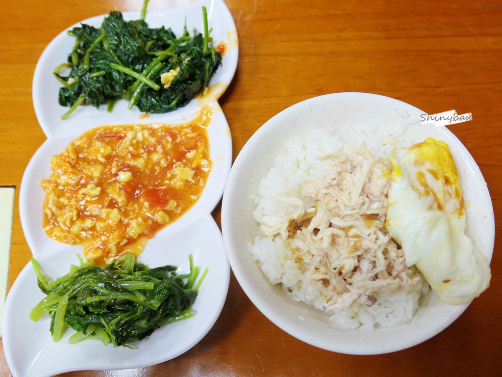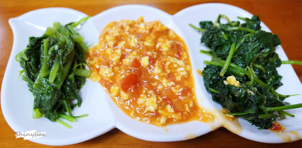 配菜有:炒地瓜葉、番茄炒蛋,炒莧菜,整體來說營養很均衡,調味做的挺剛好不會過鹹,但番茄炒蛋的蛋有點太碎,不太容易食用。