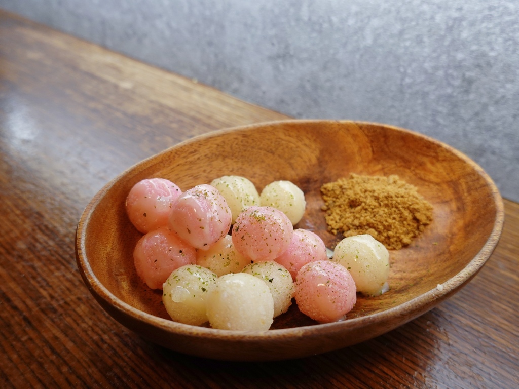 包心炸湯圓再淋上煉乳、少許海苔粉,一旁還有黑糖可以沾取,又香又甜,讓這餐劃下很美好的句點,即使一個人用餐也很滿足。