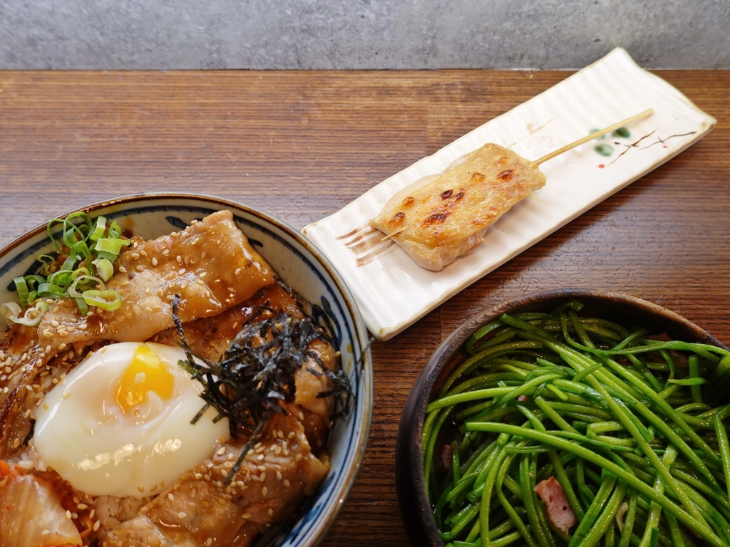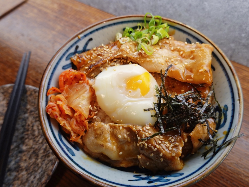 丼飯的內容物有泡菜、溫泉蛋還有約五片的豬五花,上頭有撒上海苔絲、芝麻柴魚跟少許蔥花。下方則是鋪墊著滿滿的白飯,很有飽足感。