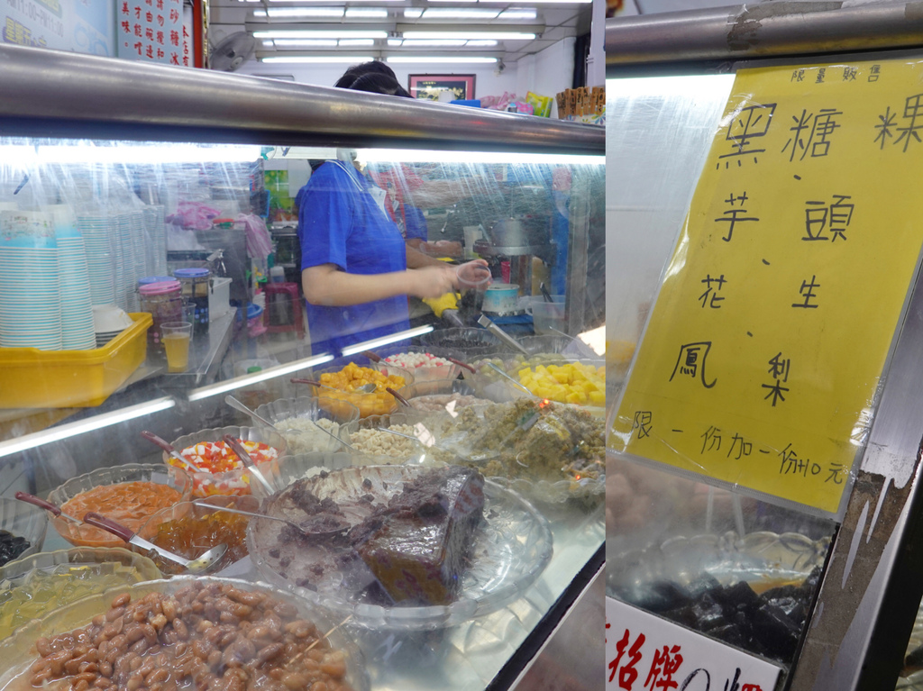 店家有提供二十餘種的配料可做選擇,一碗可以選五種。舉凡常見、不常見的都能在「陳Q黑砂糖剉冰」嚐到,而招牌不外乎是店家自製的黑糖粿。
