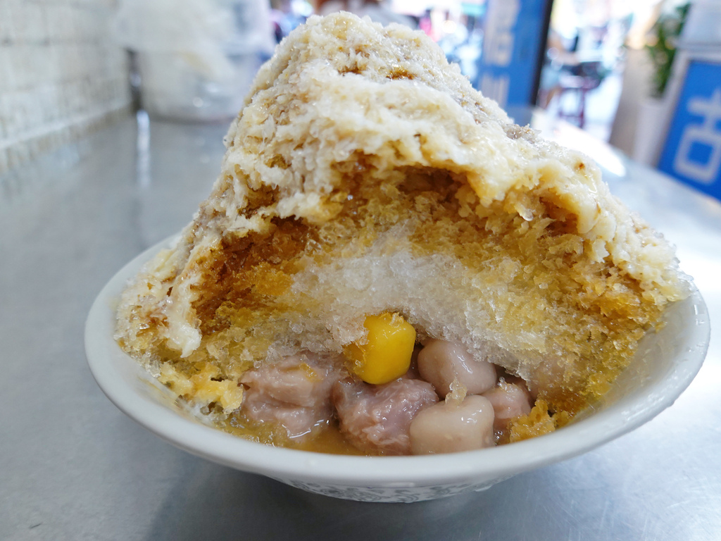 店家的黑砂糖醬很濃稠,吃起來有點焦香味,剉冰下藏著滿滿的配料,份量不少,建議兩人分食會比較剛好一點。