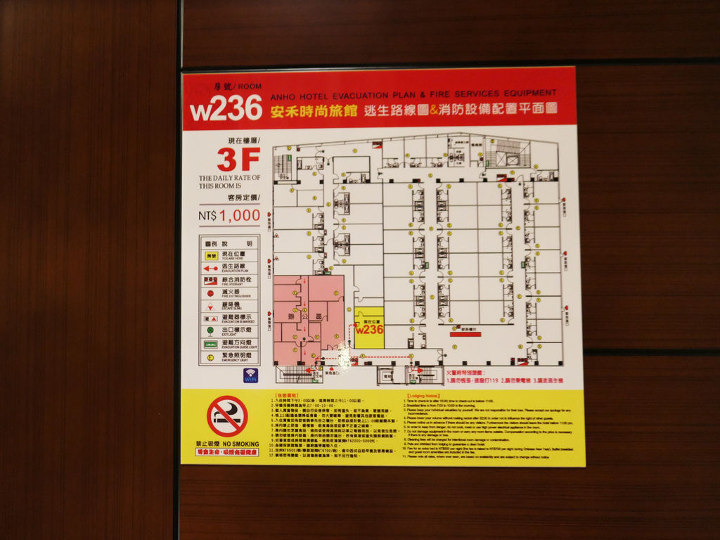 門後有必備的逃生路線圖跟消防設備配置平面圖。