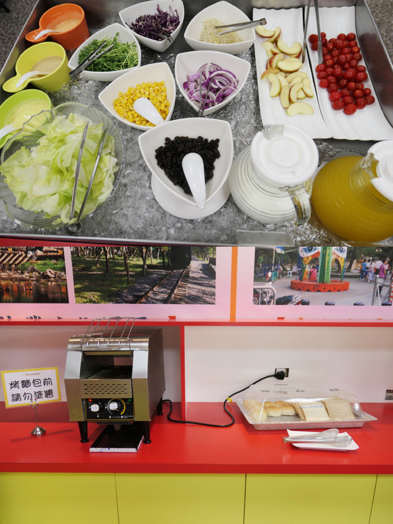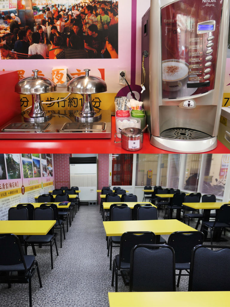 旅館附的早餐是採自助式,用餐時間為早上7:00-10:00,餐廳需要走到一樓停車場旁空間,整個桌椅的擺設很像回到以前學生餐廳阿,自助餐有中式跟西式,但看起來都不是太過新鮮跟美味……加上個人早餐喜好不喜歡吃太油膩的食物,所以就隨意烤個麵包喝杯咖啡,草草結束早餐時光。