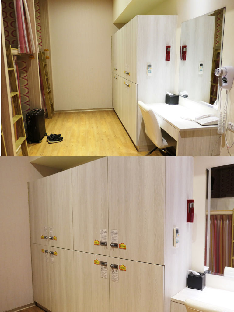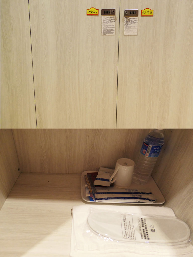 大型保險櫃兼具衣櫃跟置物櫃的功能,雖然外面是密碼鎖,但還是用鑰匙開,裡面有擺放一些旅館提供的備品,有一條小毛巾、拖鞋、杯子、牙刷等,算是滿齊全。