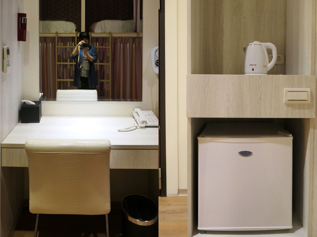 化妝台有一面滿大的鏡子,旁邊有吹風機可以在前面吹頭髮,但滿容易吵到同房旅客就是,還是建議在浴室做使用囉!房裡還有提供一個小冰箱跟熱水壺,但入住當天都是沒有旅客使用。